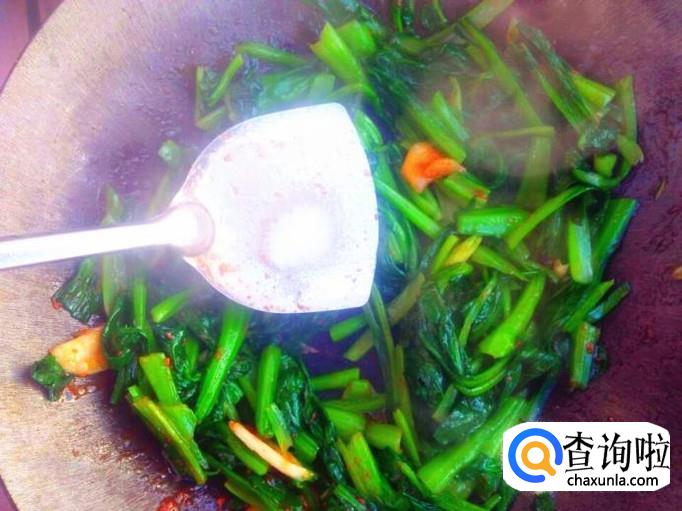 一点食盐和味素放进去翻炒,让小油菜入味,食盐不用很多,蟹籽酱里面有一点盐分的。