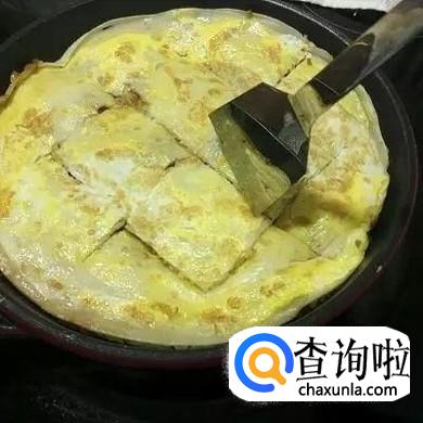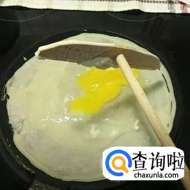 打入鸡蛋,弄匀。当煎饼起泡时,翻面。