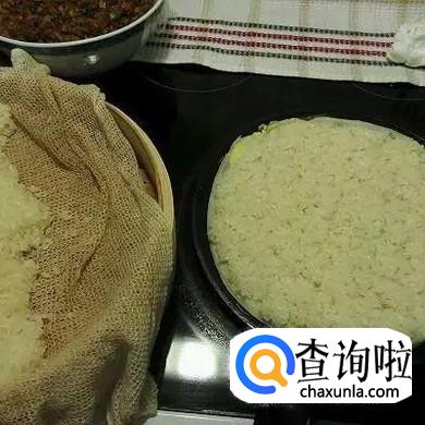 糯米洗净,泡一个晚上,放在蒸笼中,蒸半个小时。