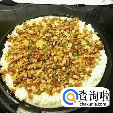 取出糯米,均匀铺在面皮上,铺好后继续铺浇头。