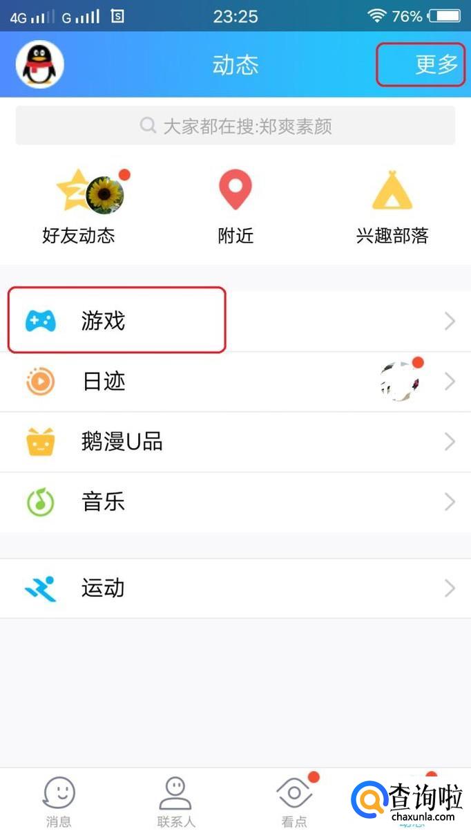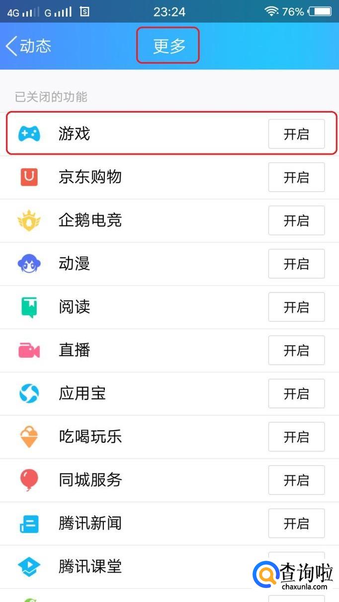 在“动态”里面找到“游戏”,点击一下,如果找不到“游戏”,就点击右上角“更多”,在里面找到“游戏”并开启就可以了。