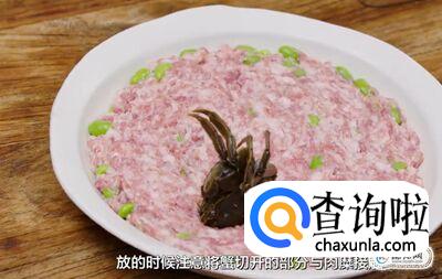 将洗净的六月黄去脐盖,然后对半剖开,将剖开的内部放在肉糜上。