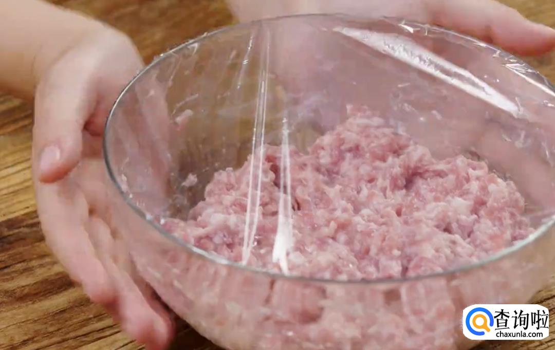 选用三分肥七分瘦的肉糜,加盐、糖、胡椒粉、料酒、生抽、几勺葱姜水搅拌均匀,然后加一些油,用保鲜膜密封好冷藏。