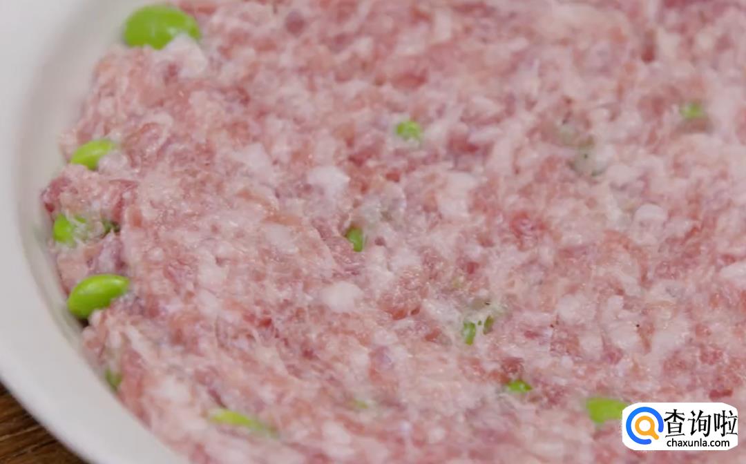 剥好的毛豆放沸水里焯一分钟捞出,放入肉糜里搅拌均匀。