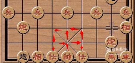 士“(仕)”的走法:士(仕)行斜线,即它的行走线路局限于“将(帅)”所在九宫内,此子行走时每次只能斜移一格,围绕将(帅)行走以保不失将(帅)。