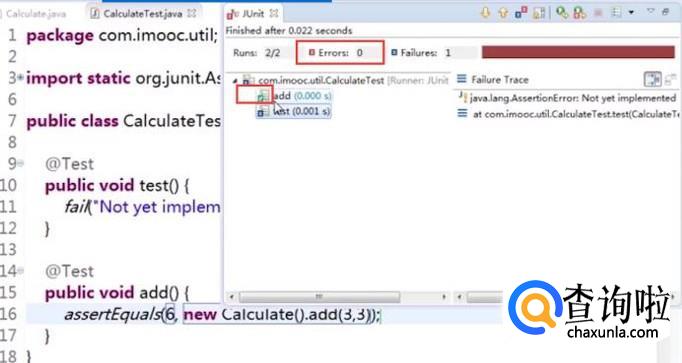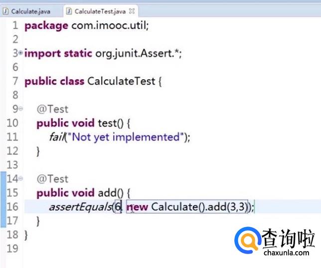 然后书写测试类的代码,如下图所示,利用junit中的assetEquals方法进行加法测试,如下图所示