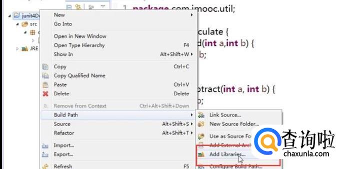 然后我们右键单击项目,选择Build Path下面的Add Libraries选项,如下图所示