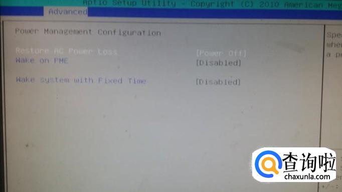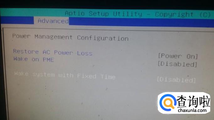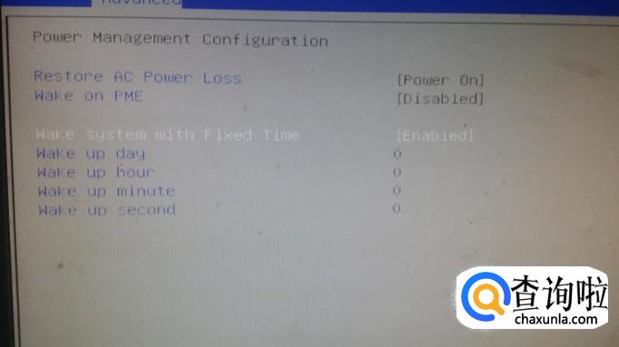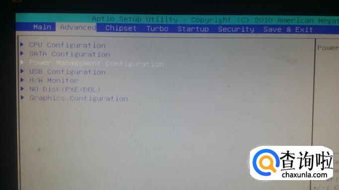 我们用键盘的左右键把最上边的白色亮块选到“Advanced(高级选项)”,用上下键定位到“power management configuration(电源管理设置)”,按“enter”键确认