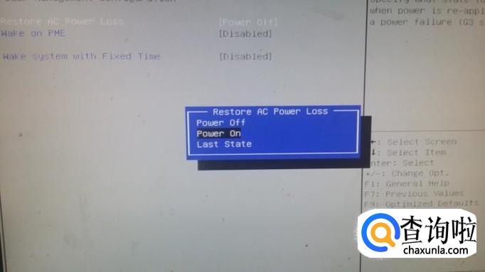 在下一个界面我们选“restore AC power loss(断电后再通电自动开机)”,后面括号内的选项默认是“off”