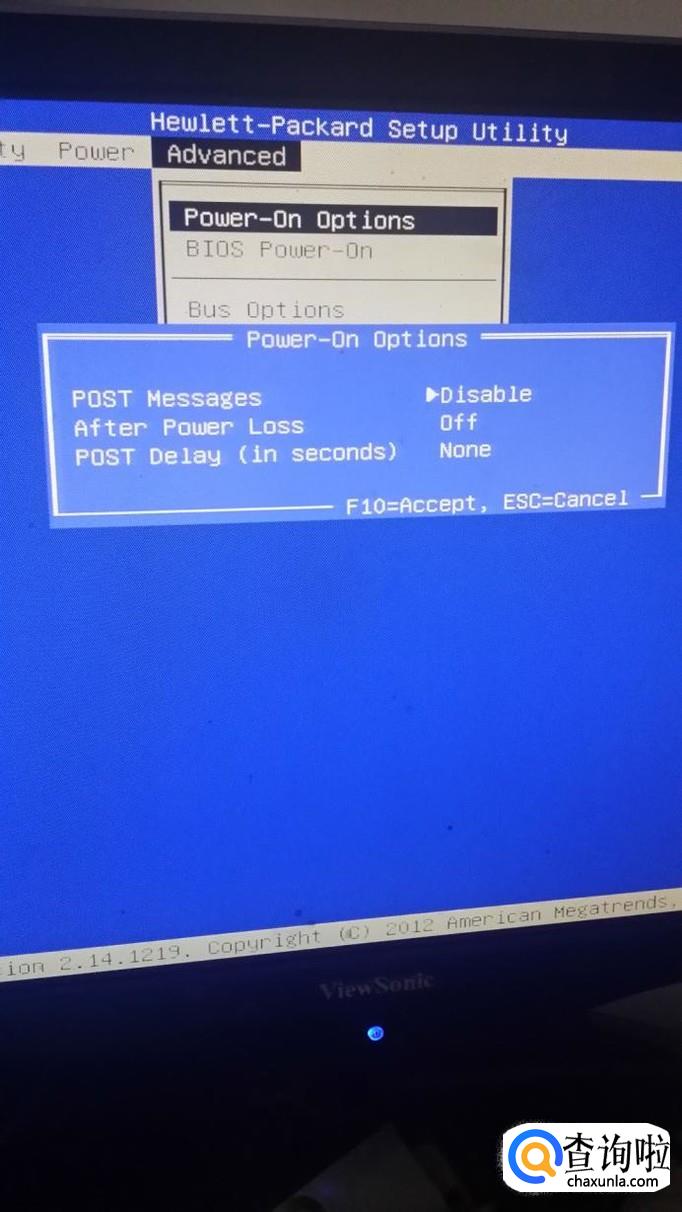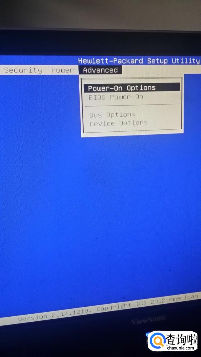 我们用左右键把黑色光块调到上面一行菜单的“advanced”,再选第一行“power-on options”,按键盘的“enter”确定