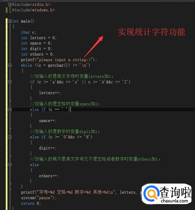 接下来我们就开始实现字符统计的功能,主要是挨个读取字符串中的字符,然后判断字符的类别,如下图所示
