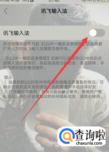 打开之后,将图示位置开关打开即可设置讯飞语音输入法QQ中一键发送表情包,如图所示。