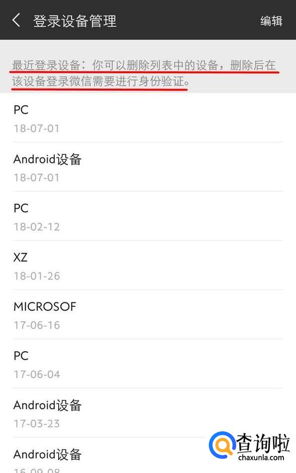 微信主要记录的是登录设备,找到“登录设备管理”,里面记录的是每台登录过微信的设备名称以及每台设备最近一次登录时间;
