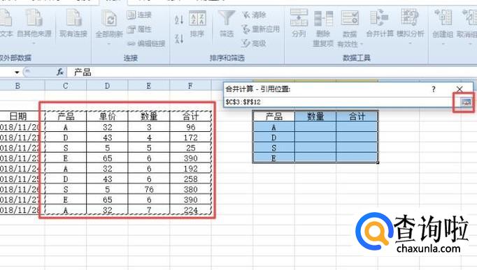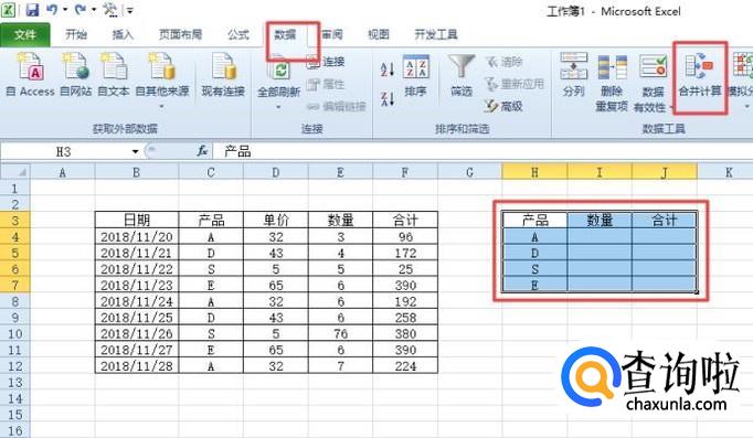 然后我们选中图示中的区域,之后我们点击数据,然后我们点击合并计算;