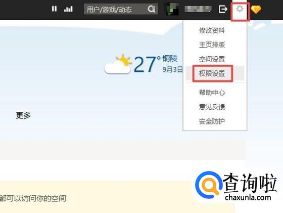 首先,我们登录我们的QQ空间,之后我们点击右上角的设置按钮,弹出的界面,我们点击权限设置;