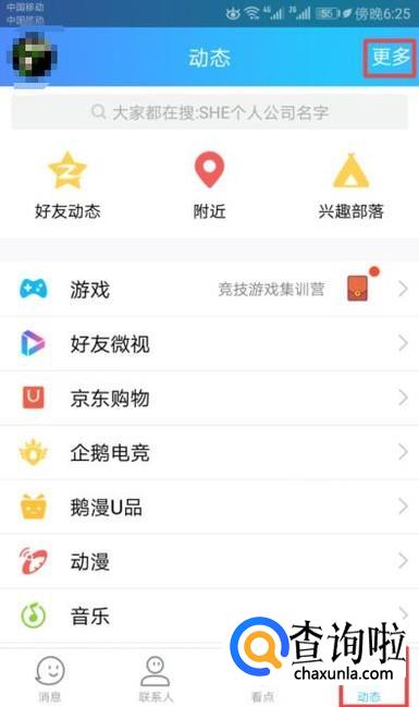 首先,我们打开我们手机上的QQ,然后我们点击动态,之后我们点击更多;