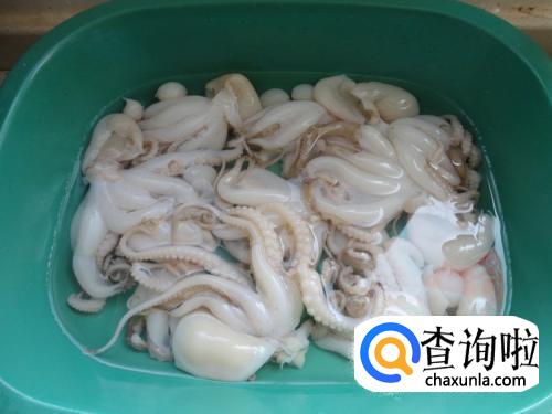 冲洗完以后,水里加入适量醋和碱面,再放进章鱼,用手不停搓洗,至章鱼表面的粘液被清洗干净。