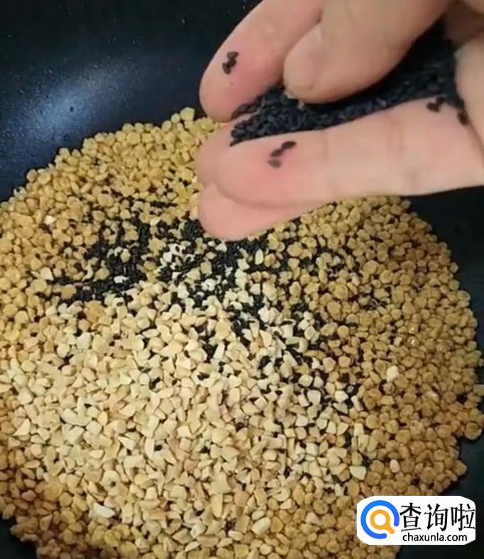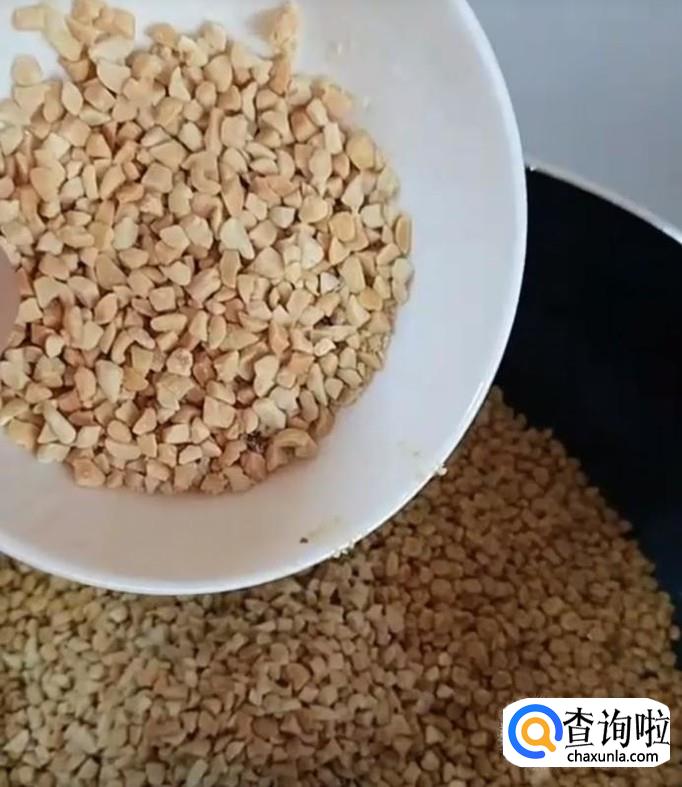 倒入玉米片,使玉米片都染上糖色,之后加入熟的花生碎