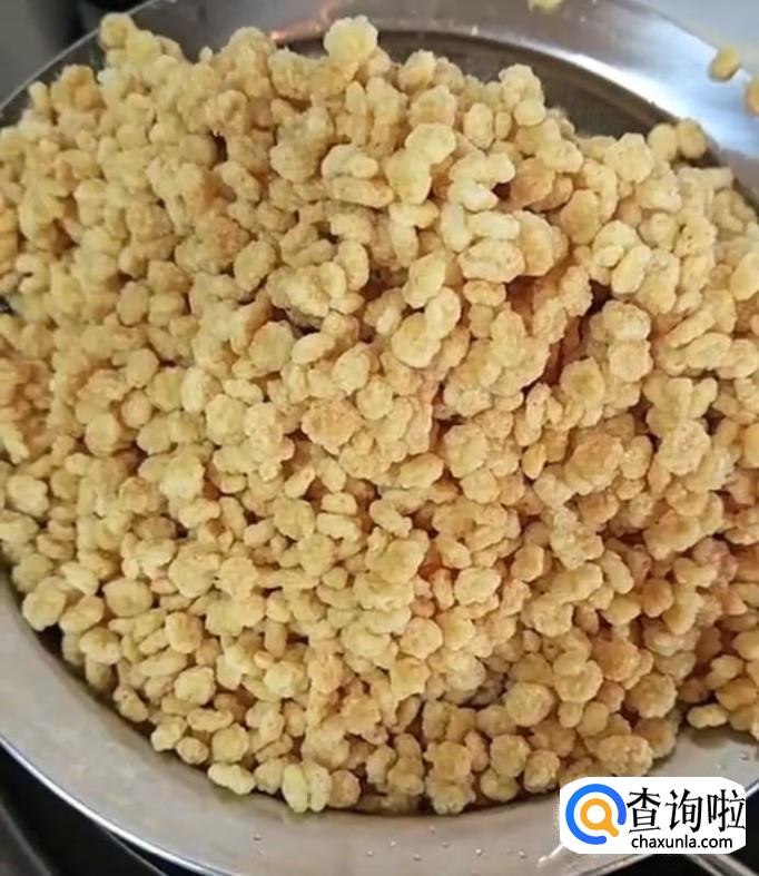 将玉米片炸至变色,同时看到玉米片已经飘起来了,迅速将玉米片捞出来。
