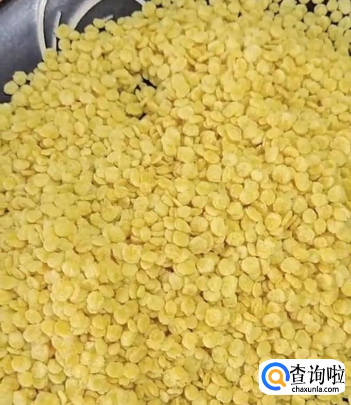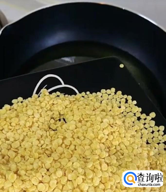 炒锅放油,油温七成热的时候,将玉米片下油锅炸一下。