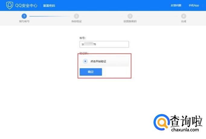 点击进入QQ安全中心,在网页中输入要找回密码的QQ帐号,点击确定按钮进入下一步。