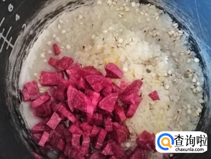 把淘洗好的大米、小米、薏米,放入电饭锅中,然后放入备好的紫薯,最后加入适量清水。