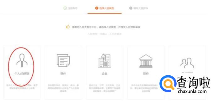 然后选择【注册类型】,有个人、媒体、企业等等,如下图所示: