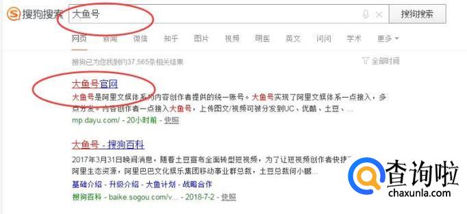 在浏览器搜索【大鱼号】,点击相关链接,如下图所示: