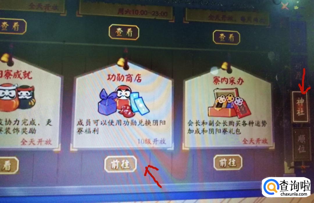 然后点击右侧的“神社”,然后点击“功勋商店”。
