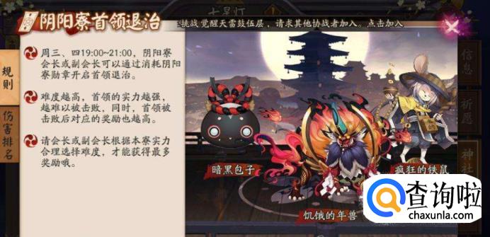 要记住每周周六晚上的七点至晚上九点,阴阳寮长或者副会长可以通过消耗阴阳寮开启首领退治,首领有三种,首领难度需要会长或者副会长根据寮实力自己选择,实力越强越难以被击败。