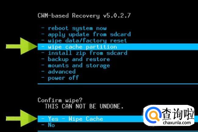 完成后再选择“wipe cache partition”(清除缓存),同样按电源键确认。
