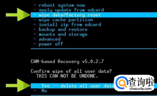 先选择第一条“wipe data/factory reset”(清除所有信息,恢复出厂设置)选项。按电源键确认。