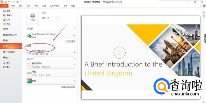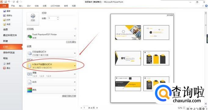 在打印界面中出现打印设置,我们就是在这里设置幻灯片打印张数。