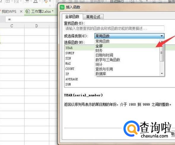 在“插入函数”选项卡中,在“或选择类别”的下拉菜单中选择“全部”。