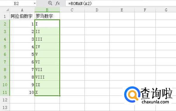 接着,向下填充函数公式,就可以将其他阿拉伯数字转换为罗马数字。