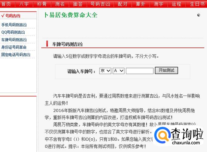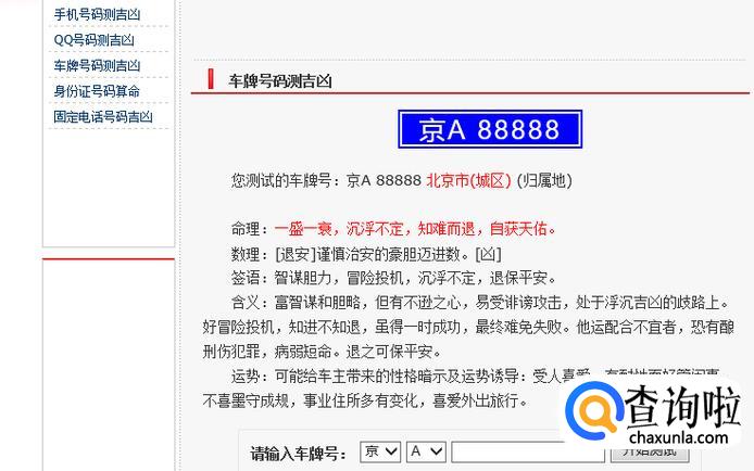 百度搜索"车牌号码吉凶测试"。进入http://life.httpcn.com/cp_jx.asp