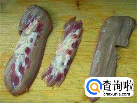 清洗干净的猪腰子用刀全部切开,记住了,一定要对半剖开,然后用刀将剖开的猪腰子里面的骚筋清理干净。