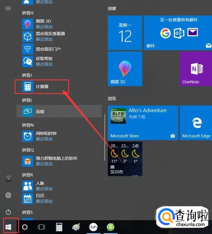 这里我以Win10系统中的计算器程序为例,点击打开开始菜单,找到计算器程序,即可打开系统中的计算器应用程序。