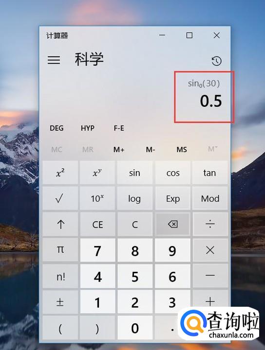 点击sin标志之后,我们就可以在计算器程序中看到计算结果已经显示出来了,结果为0.5。