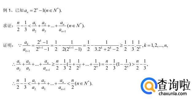此题不等式左边不易求和,此时根据不等式右边特征, 先将分子变为常数,再对分母进行放缩,从而对左边可以进行求和. 若分子, 分母如果同时存在变量时, 要设法使其中之一变为常量,分式的放缩对于分子分母均取正值的分式。如需放大,则只要把分子放大或分母缩小即可;如需缩小,则只要把分子缩小或分母放大即可。