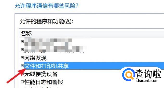 在这里找到‘文件和打印机共享’,并确保勾选上。这样就可以了。