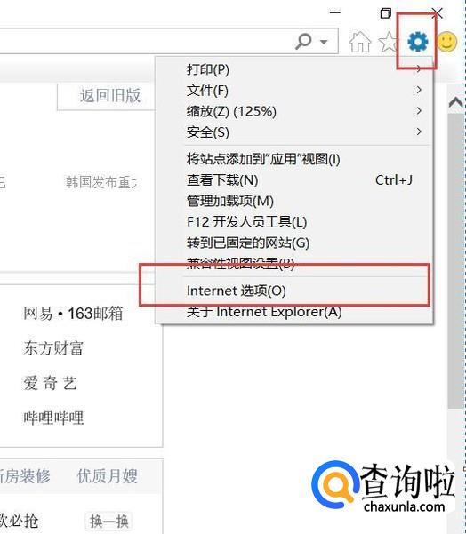 首先,我们打开电脑系统中的IE浏览器,打开IE浏览器主页面,点击页面右侧“设置”按钮,选择“Internet选项”菜单。