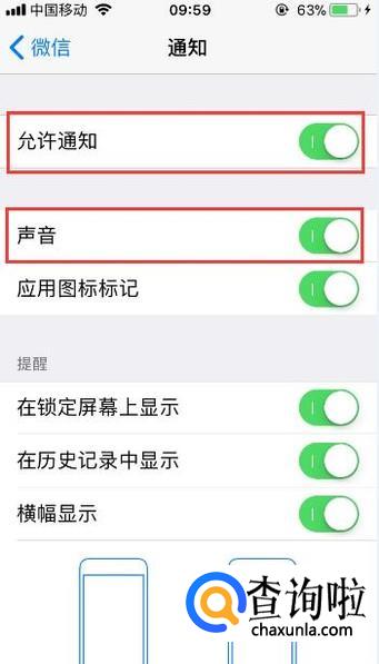 接着点击【通知】功能进入到【通知】页面,在该页面需要开启声音以及允许通知两个功能。