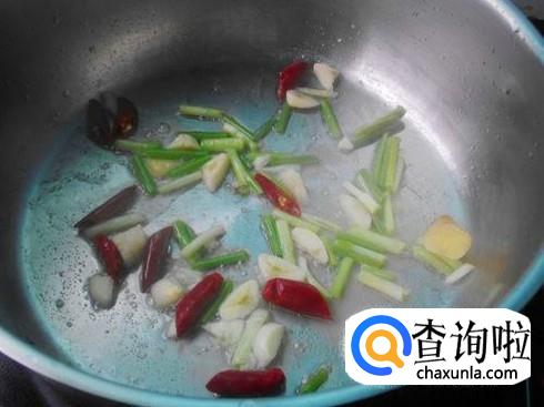 锅里加上清水,把葱段、生姜片、大蒜片、八角、红辣椒、香叶放进去,再加上一点点食盐烧开。
