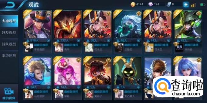 进入观战界面后,首先映入眼帘的便是左侧第一位的“大神观战”。这里有各种王者段位的大神在线游戏,供你选择。