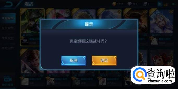 在大神观战界面选择你想要观战的英雄或者大神,点击该英雄后进入如下界面,选择确定,进入观战实况界面。