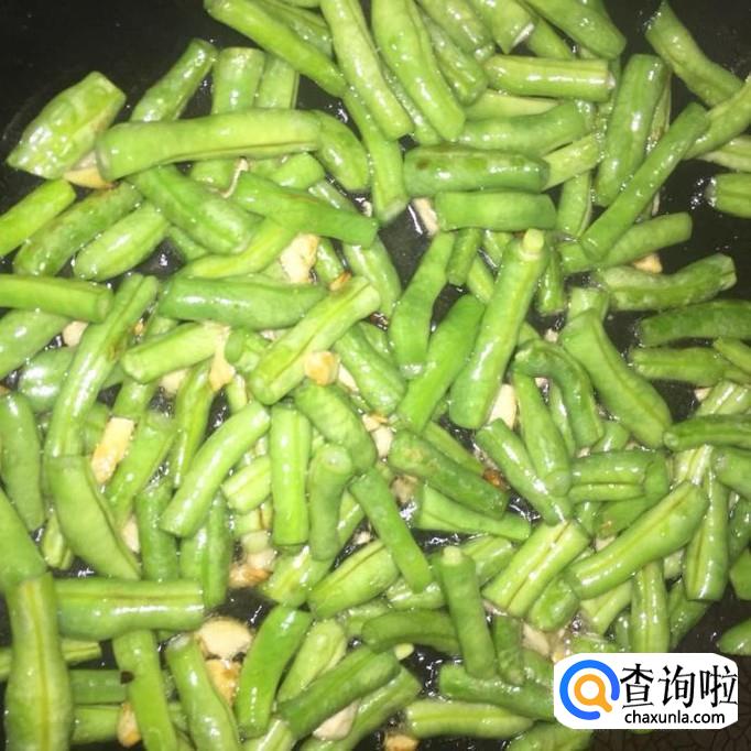 开炒锅,锅里加适量的食用油,待油温升高后,将四季豆和蒜头下入锅里,加少量盐和鸡精,翻炒至熟,盛出装盘;