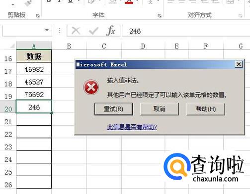 如下图中所示,当在A20单元格输入数值时,就显示非法警告语。
