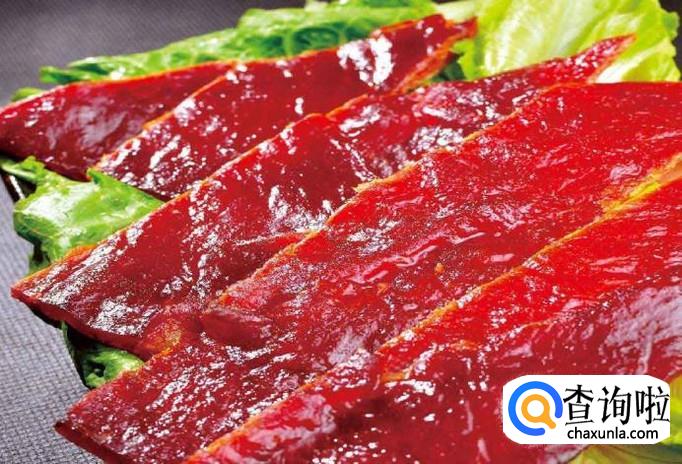 最后便是烧烤猪肉干了,也就是我们现在说的猪肉脯。肉片晶莹剔透,薄得如同一张纸的肉片,配上鲜红的颜色,让人垂涎欲滴又不忍食用。