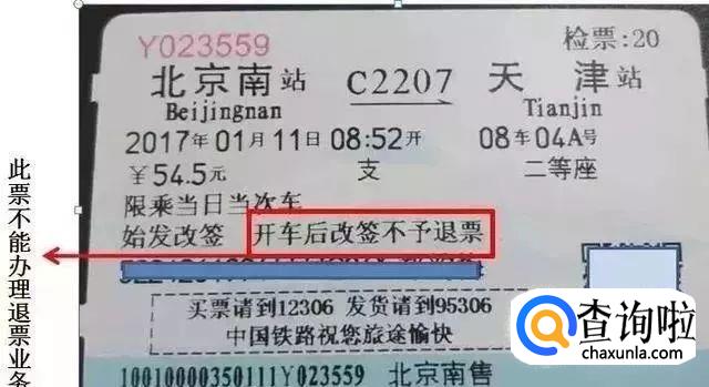 开车后不予退票:车票上标有“开车后改签不予退票”字样的,说明原票是在开车后办理的改签,此票即使在开车前也不能办理退票。不能退不能再改,所以为避免耽误行程还是要按时乘车哦。